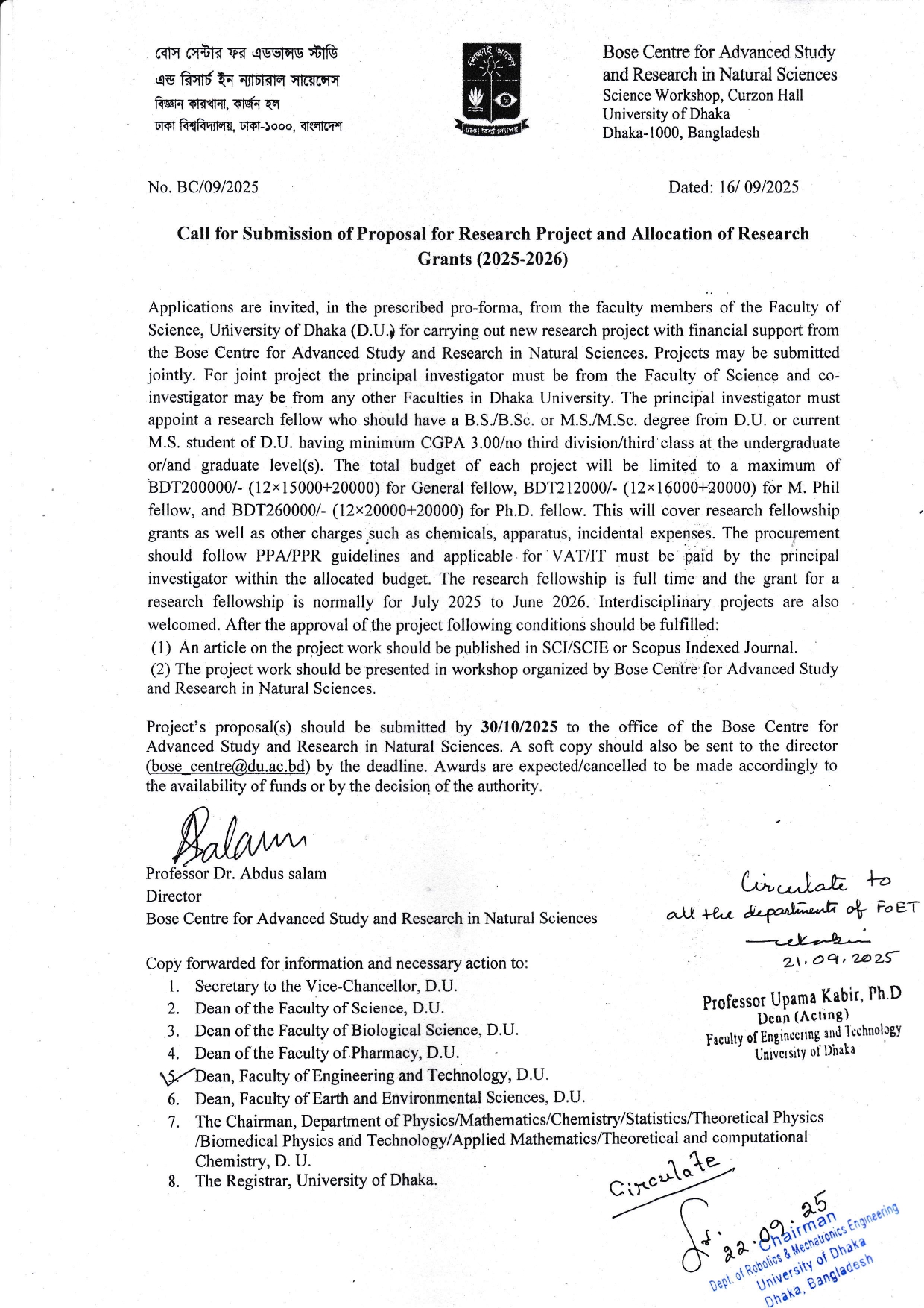 Call for Submission of Proposal for Research Project and Allocation of Research Grants (2025-2026)